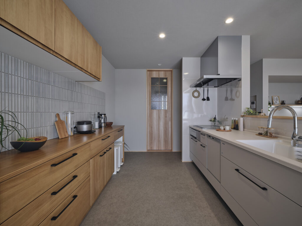 ・木目×グレージュの壁で落ち着いた印象に・珪藻土やタイルを取り入れたおしゃれな素材使い